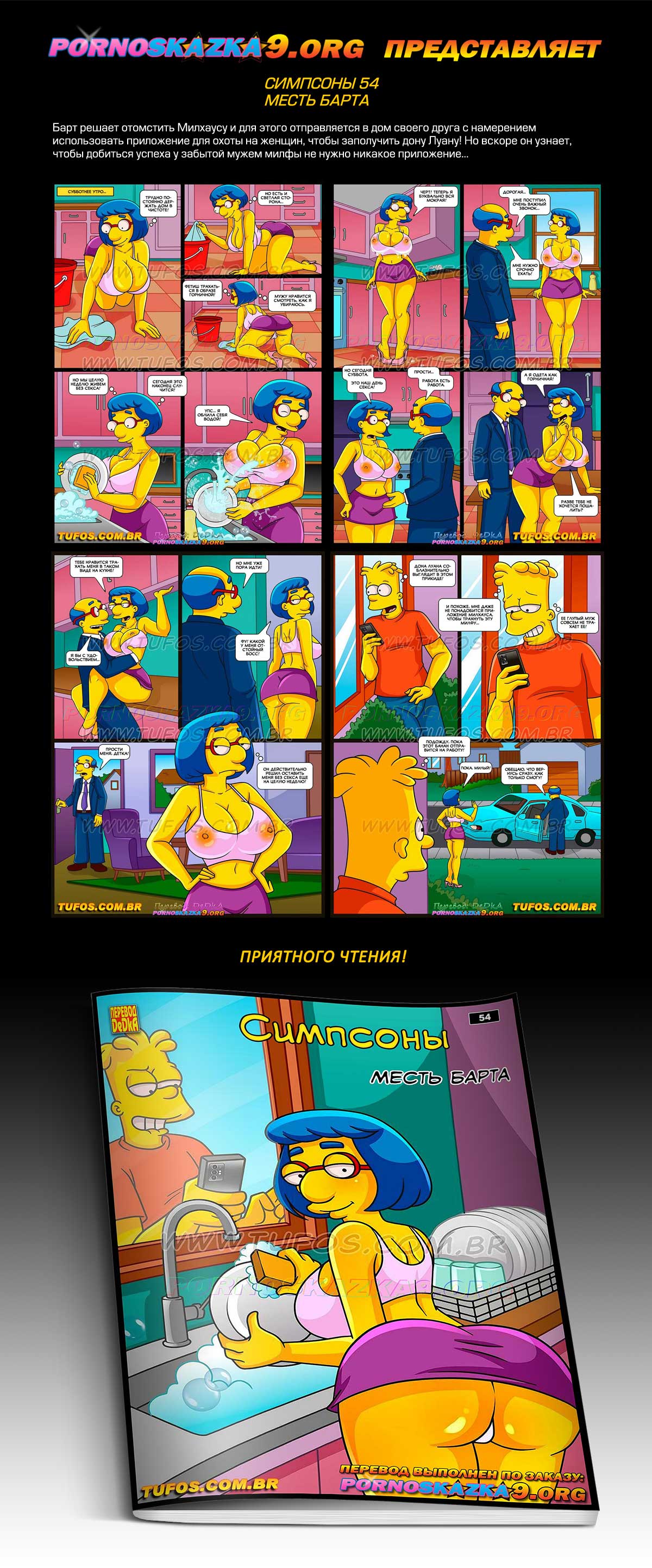 Порно комикс «Симпсоны. Часть 54. Месть Барта. Барт решает отомстить Милхаусу и для этого отправляется в дом своего друга с намерением использовать приложение для охоты на женщин, чтобы заполучить дону Луану! Но вскоре он узнает, чтобы добиться успеха у забытой мужем милфы не нужно никакое приложение…